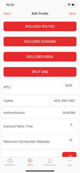 | notempty New from app version: 3.0 Only manually added profiles can be fully edited. For the Securepoint Mobile Security profile, editing is highly restricted. The only editable options are: Redirect Gateway, Verbosity, Connection Monitoring, and Widget | |||