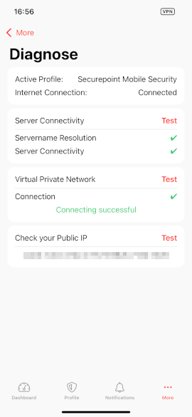| Server reachability | The Test button is used to test the reachability of the VPN Server in use. The VPN connection is briefly interrupted for this purpose. | ||