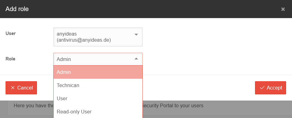 in ‘'Mail Security’' can be assigned to a selected user. All roles except ‘'Admin’' restrict the use of the portal.