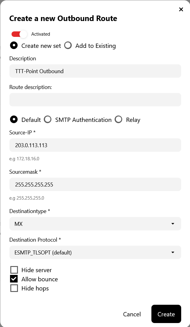 - If Microsoft 365 (Office 365) is used, the option Relay option must be selected and the route linked to the incoming domain.