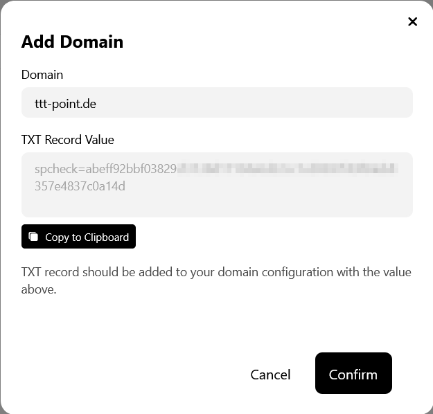 - As soon as the entry is set at the provider, the domain can be added in the portal with the button.