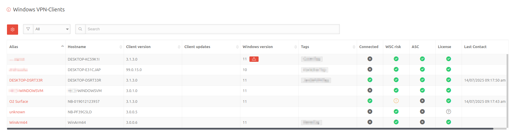 The dashboard provides an overview of the current status of the existing Windows VPN clients.