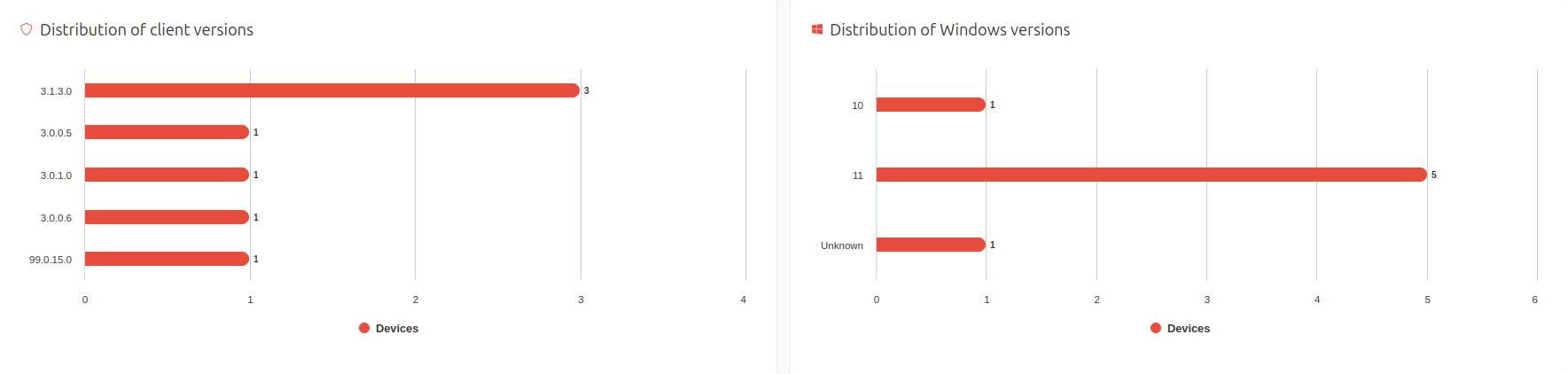 | Two overviews show the distribution of the client versions used and the distribution of the Windows versions used. | ![]() | |