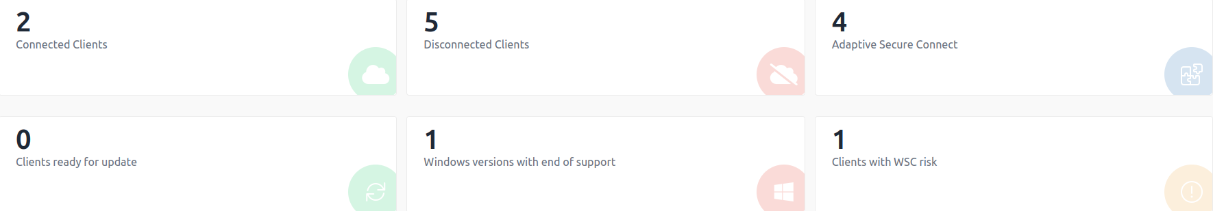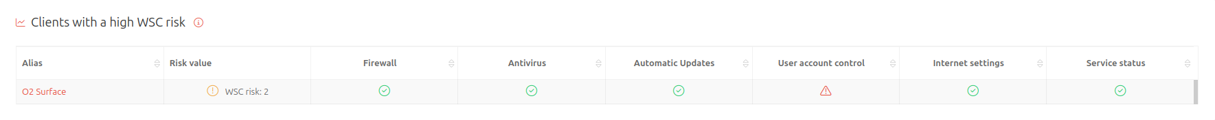 Windows VPN clients that have been identified as having a high Windows Security Center (WSC) risk are listed here in tabular form and the area of the WSC risk is also displayed. Lists the 5 clients with the highest risk value in descending order. | ||