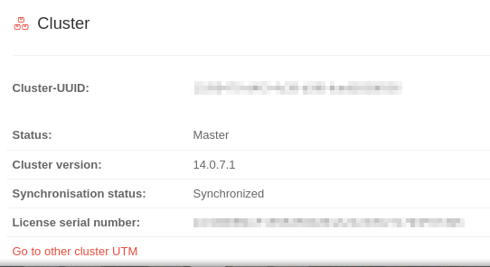 | Information on the cluster: Cluster-UUID, Status, Cluster-Version (Firmware version of the cluster partner), Synchronization status und License serial number Click on Go to other cluster UTM to go to the other cluster partner. In order for both cluster members to be assigned to each other, special new licenses must be registered on both devices. Menu Button To do this, two licenses must be downloaded from the reseller portal. If no license is marked as xynnnnn-SPARE in the reseller portal (matching licenses have an identical color marking on the left side of the table), please send an email to lizenzen@securepoint.de with customer name, customer number and the serial numbers of the devices or, in the case of VMs, with the license ID. |