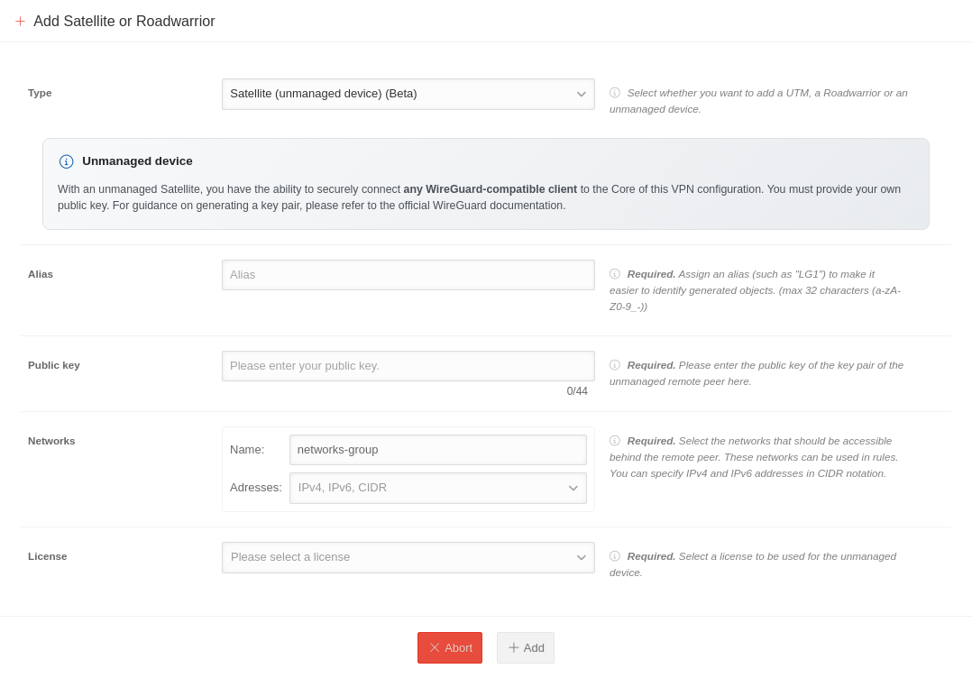 Um ein unverwaltetes Gerät als Satellit hinzuzufügen, wird bei einem aktiven, verbundenen Core auf die Schaltfläche Satellit / Roadwarrior geklickt. Es öffnet sich ein Dialogfenster, in dem das neue Satellit konfiguriert wird.