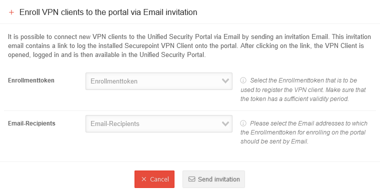 | It is possible to connect new VPN clients to the Unified Security Portal via e-mail by sending an invitation e-mail. This invitation e-mail contains a link to log the installed Securepoint VPN Client onto the portal. After clicking on the link, the VPN Client is opened, logged in and is then available in the Unified Security Portal. An e-mail invitation can be sent using the dialog behind the Enroll new VPN client button. Same dialog as under Button Enroll new VPN client | |||