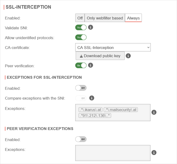 | CA-Certificate: | CA-SSL-Interception | Here, a CA must be selected that can re-encrypt the connection after decryption (and scanning). The public key of the CA must be installed on all client computers that are to use SSL Interception. Download can be done here directly with . | |