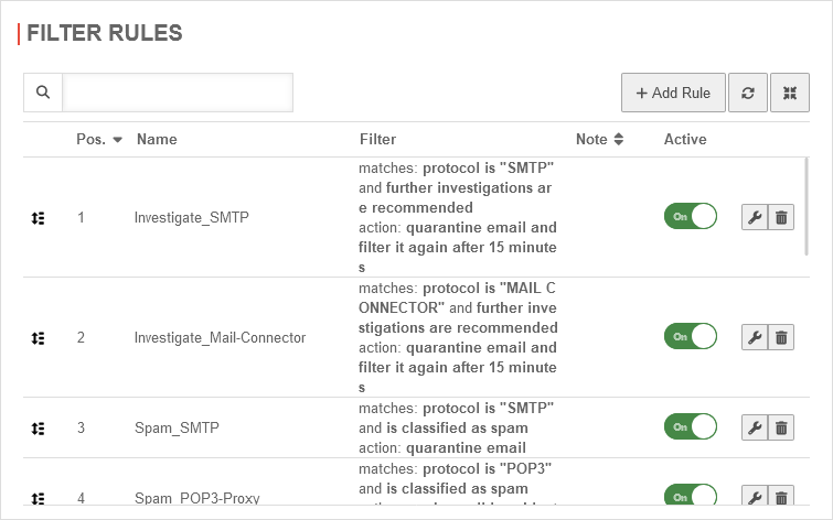| The filter rules are used to decide how to proceed with emails for which defined properties have been detected. A distinction is made between the SMTP and POP3 protocols as well as the mail connector. Via the Mail Connector, the UTM is able to read emails from a mail server using the POP3 and IMAP protocols and their encrypted variants POP3S and IMAPS. It also inspects them for spam and malware by using the Mailfilter. Furthermore, a distinction is made between the protocols POP3 and SMTP. If the mail relay is used, the protocol is SMTP. If the POP3 proxy is used, the POP3 protocol is selected. |