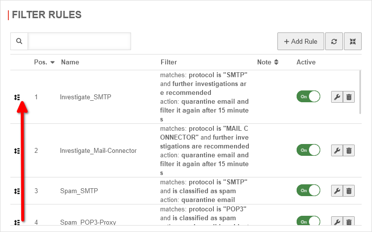 | In a allowlist rule, the acceptance of a mail is defined under certain conditions. In order for a rule to work as a allowlist rule, the order must be defined so that this rule takes precedence over the general spam quarantine rule. By clicking and holding the left mouse button on the allowlist rule (pos. 7) in the "Pos." column, this rule is moved upwards above the general Spam_SMTP filter rule. Once the rule has reached the desired position, the mouse button is released and the allowlist rule is assigned a new position number according to its ranking. | UTMuser@firewall.name.fqdnApplications Move filter rule
