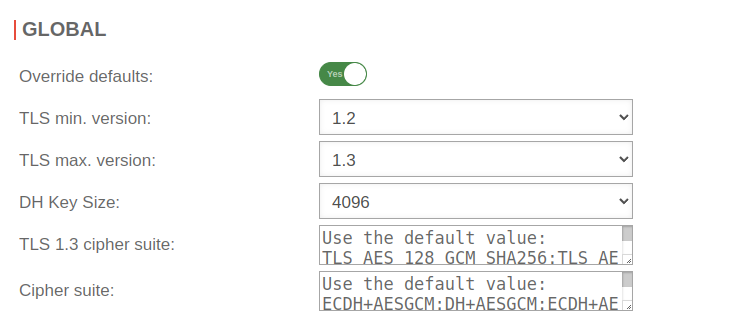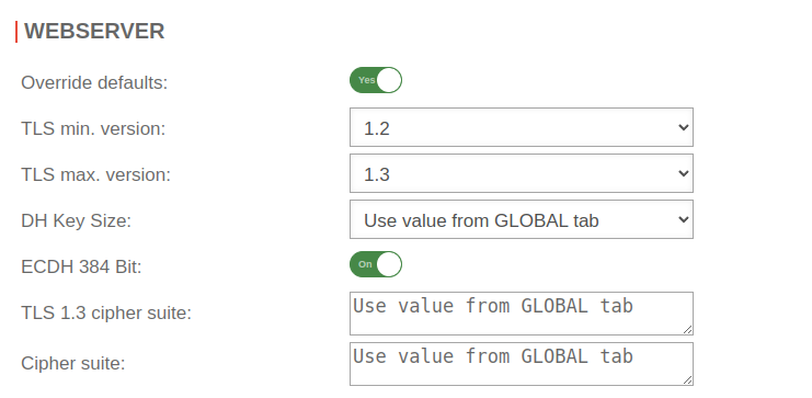 | Cipher suite: | Transfer value from GLOBAL tab | In the field Cipher-Suite the desired encryption and modes can be defined. Default ECDH+AESGCM:DH+AESGCM:ECDH+AES256:DH+AES256:ECDH+AES128:DH+AES:ECDH+3DES:DH+3DES:RSA+AESGCM:RSA+AES:RSA+3DES:!aNULL:!MD5:!DSS | |