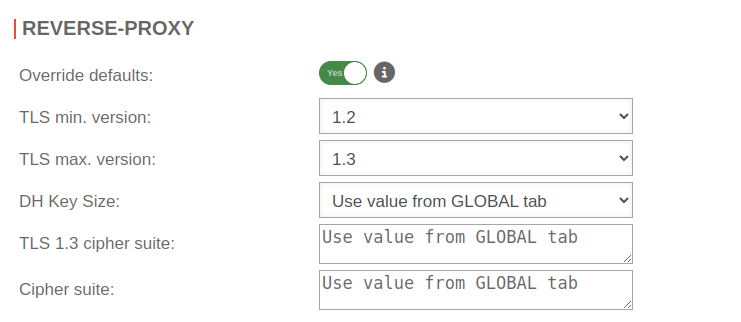 Reverse-Proxy Reverse-Proxy notempty These TLS settings apply to the connection between this appliance and the clients. The TLS settings between the servers' (to be reached via the reverse proxy) and this appliance are configured under . See the wiki for Reverse Proxy | |||
