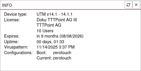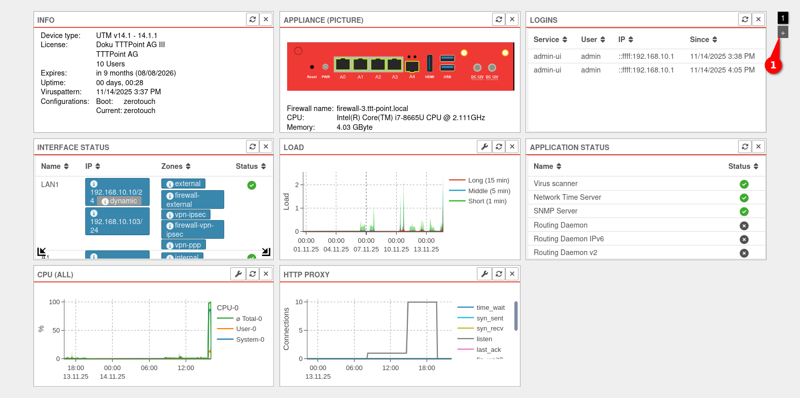 - On the dashboard, the Widgets can be found; these provide a custom overview of the current UTM status.