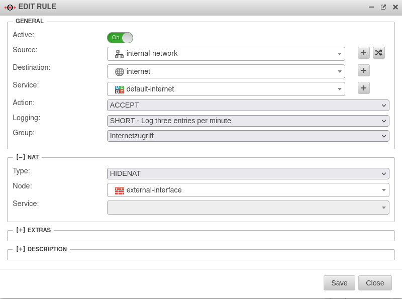 Here it must be ensured that the Internet object matches the selected HideNAT object as a rule! The rules will then look like this: