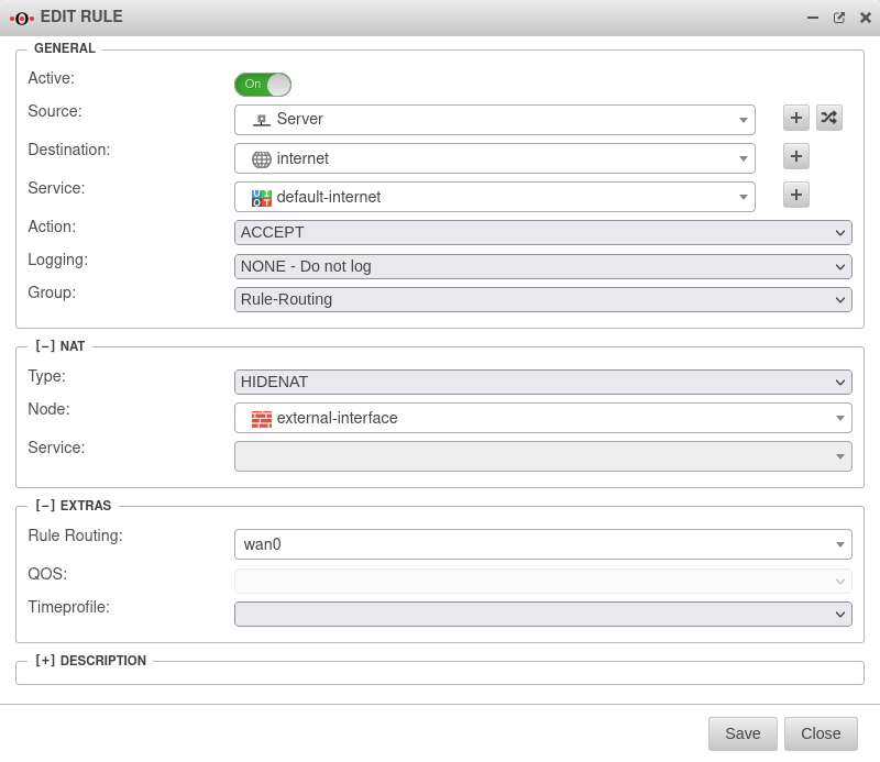 Now a rule can be defined with the network object. In the rule, the rule routing must then be specified and set to wan0 so that the server always communicates to the outside via this interface.