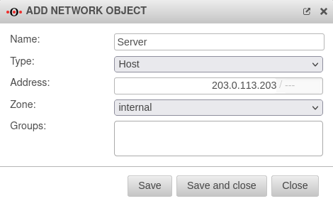 First, a network object is created for the server so that it can be specified later in the rule. In this example, the network object looks like this: