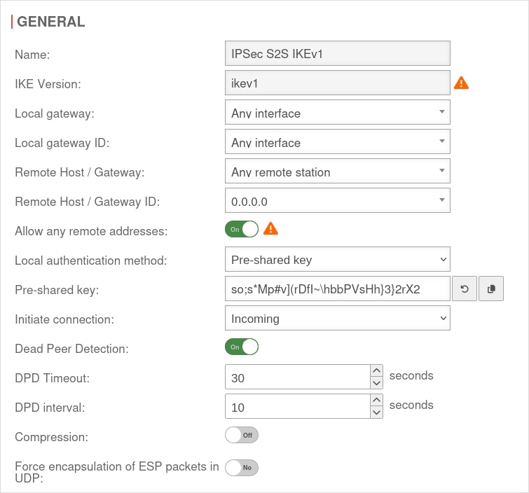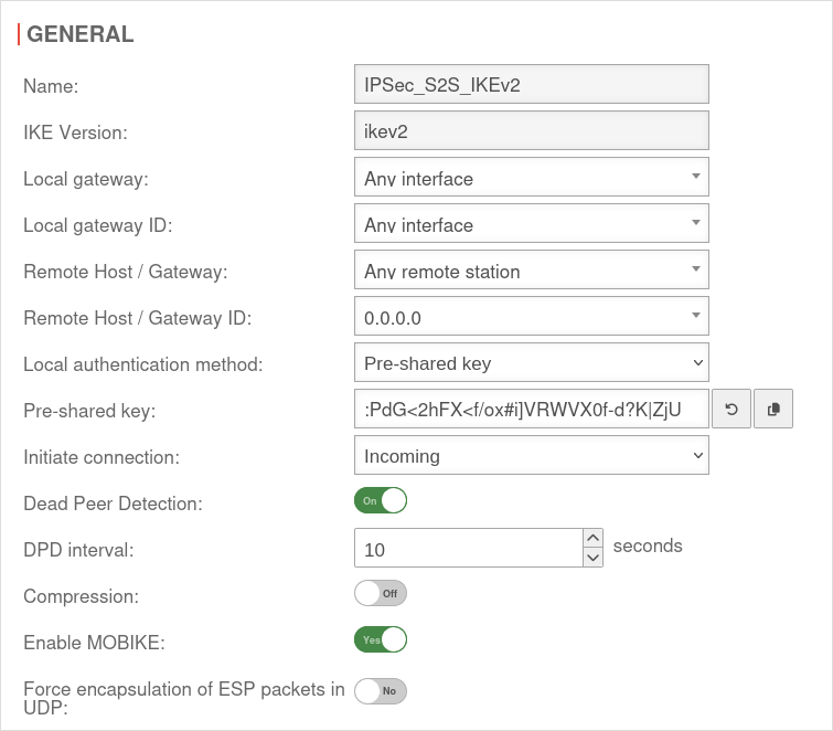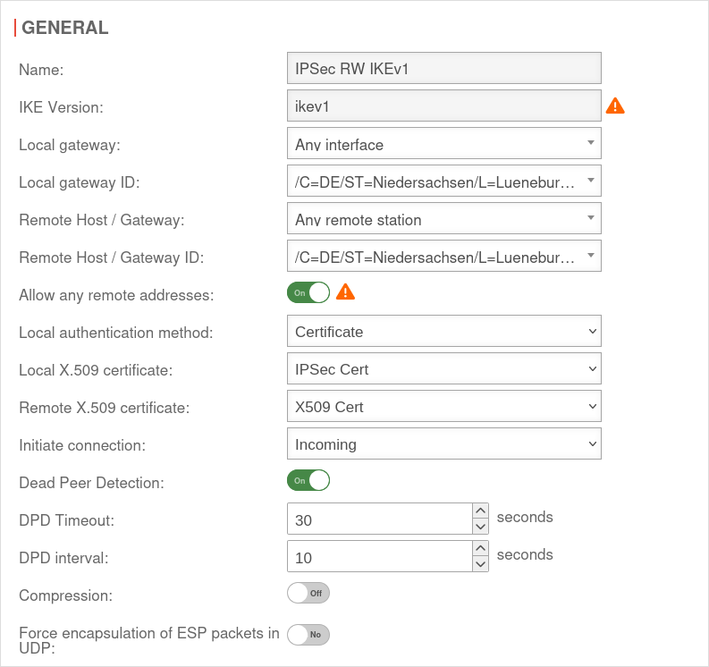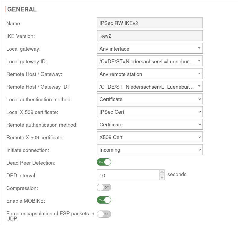 | Local Gateway ID: | The gateway ID is included in the authentication. This can be an IP address, a host name or an interface. Automatically filled in when an X.509 certificate is selected. |