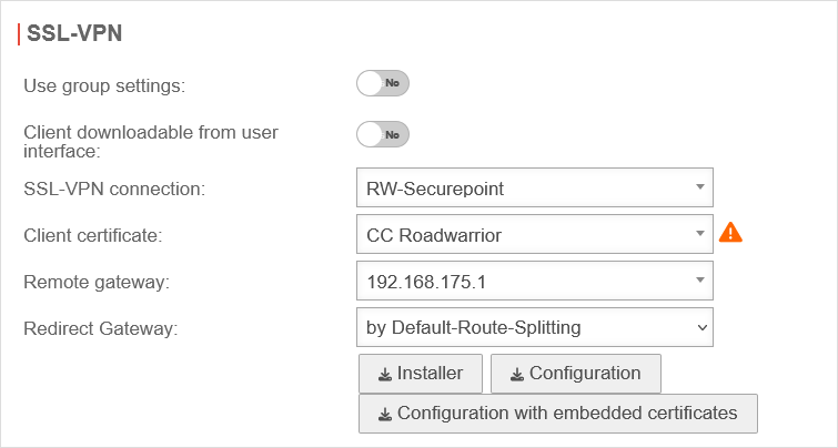 | Client certificate: | CC Roadwarrior | A certificate must be specified that the client uses to authenticate itself to the UTM. It is also possible to use ACME certificates. | |
