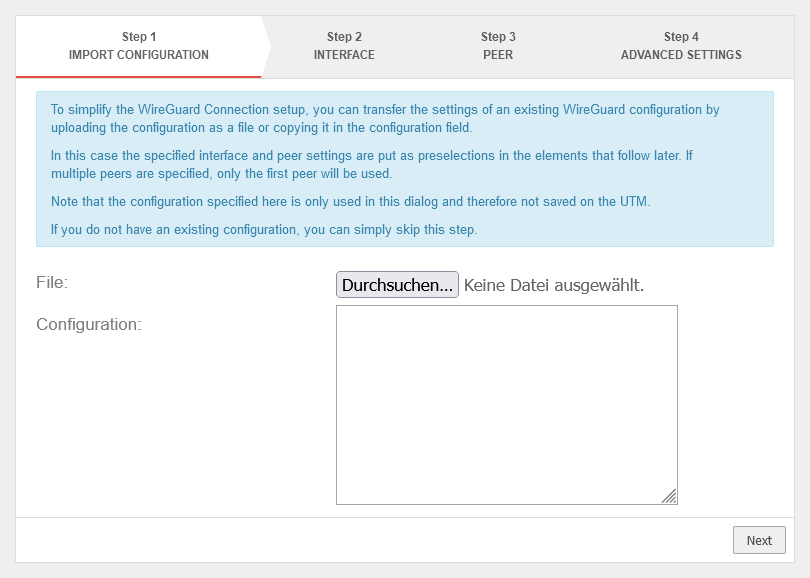| PrivateKey = | uIp… …9E3XA= | When creating a blank tunnel, a PrivateKey is assigned automatically The PrivateKey can be exported on the UTM in RAW format and then entered here. | |