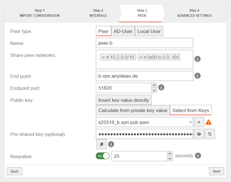 For two options, the required private or public key value is created directly in the WireGuard connection setup wizard.